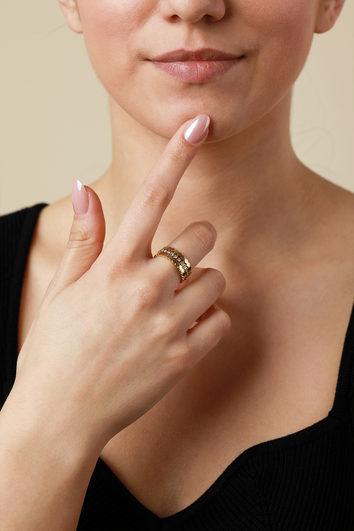SKU: Nu se aplicăInel din Stainless Steel 3in1 placat cu aur galben de 18K. Unul dintre inele este prevazut cu pietre zirconia. Se pot purta impreuna sau separat.