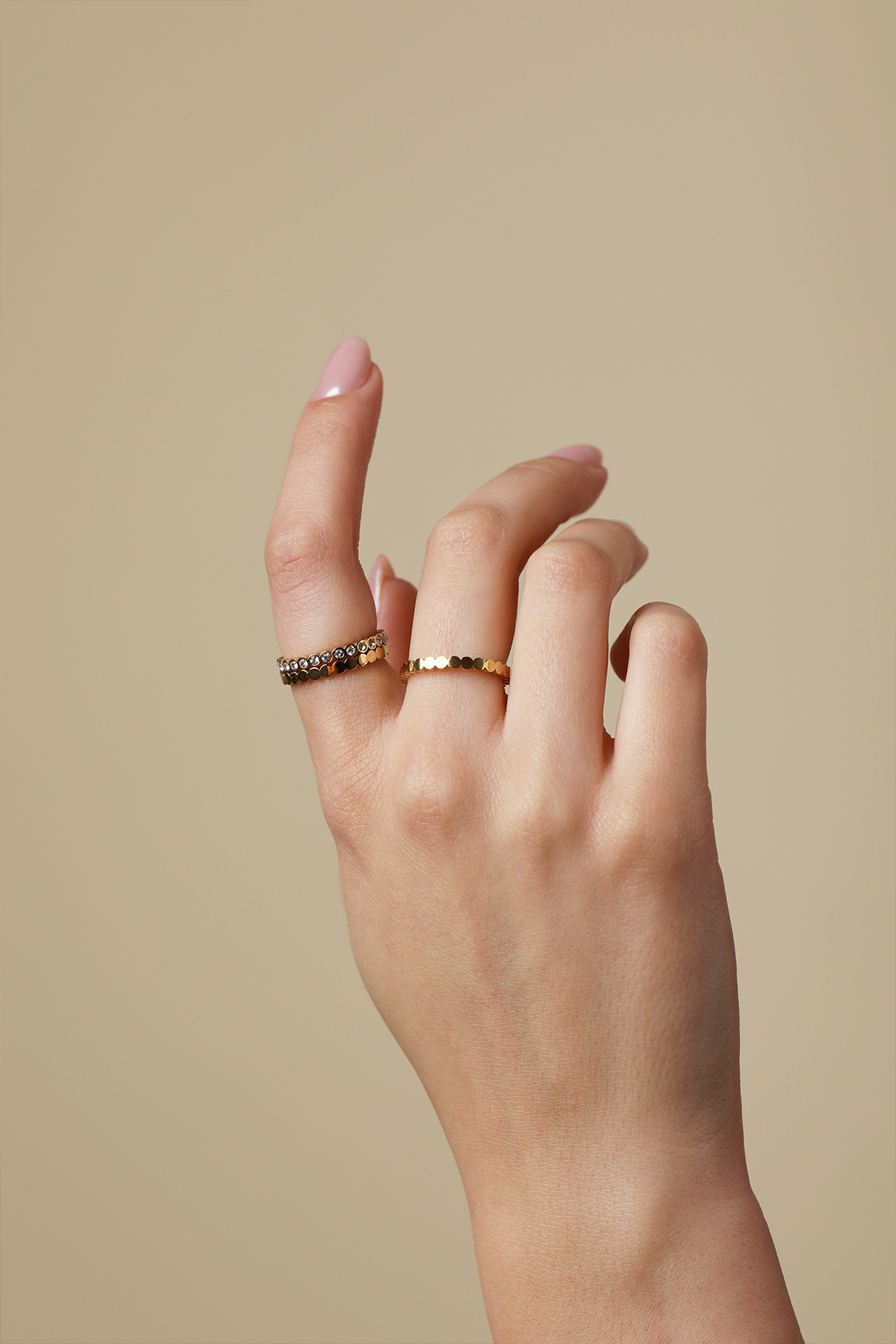 Inel din Stainless Steel 3in1 placat cu aur galben de 18K. Unul dintre inele este prevazut cu pietre zirconia. Se pot purta impreuna sau separat.