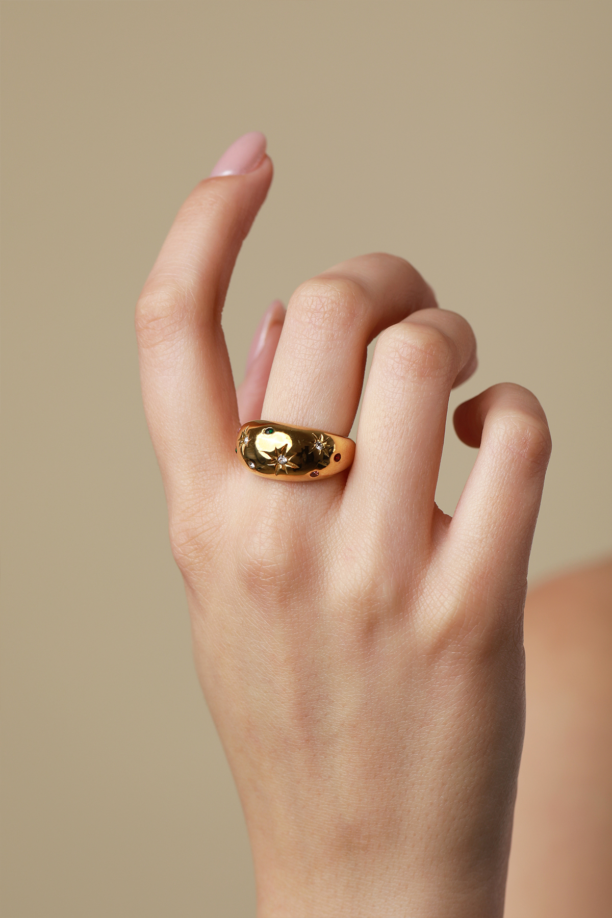 Inel din Stainless Steel Marizzo Starsplacat cu aur galben de 18K. Inelul este prevazut cu pietre zirconia transparente si colorate.